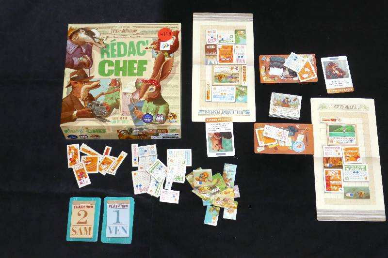 | Contenu | 1 règle de jeu original 6 plateaux Une 6 bureaux 6 tuiles Tribune Départ 12 tuiles Tribune 57 tuiles Article 29 tuitles Photo 34 tuiles Pub 6 jetons Bouclage 42 cartes 1 bloc de Score |