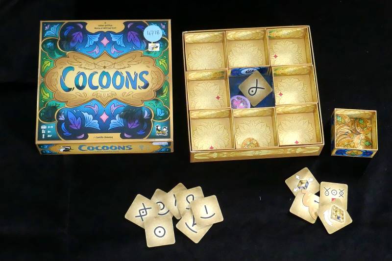 | Contenu | 1 règle de jeu original 1 plateau de jeu (la boîte du jeu) 9 petites boîtes (Cocons) 1 jeton Départ 8 jetons Animal Gardien 25 tuiles Trappe en 2 sachets 25 jetons Action |